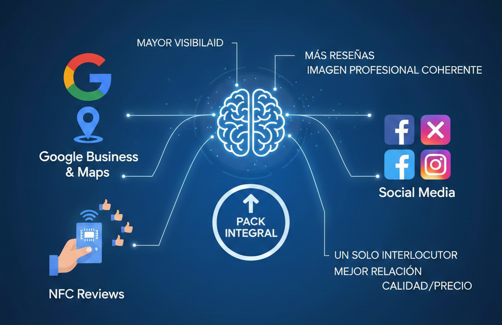 Google Business optimizado, Tarjeta NFC para reseñas y Gestión profesional de Redes Sociales, todo en un solo pack pensado para comercios locales que quieren más clientes y más ventas.